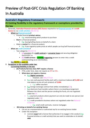 I used these notes for the class test where I received 85% and in the exam where I received 85 overall for the subject. My notes are structured very well so it is easy for you to follow. They are also colour coded legislation = pink, figures = red, which will make it easier for you to follow in the time pressure of the test/exam. The notes cover all topics which were taught in Semester 1 2019 which are: - Introduction - Legal Regulation of Banking in Australia - Regulating the Banker-Customer Relationship - The Global Financial Crisis and Banking Regulation - Post-Global Financial Crisis Regulation of Banking in Australia: Reforms and Challenges I: Post-GFC Reforms and the Royal Commission - Post-Global Financial Crisis Regulation of Banking in Australia: Reforms and Challenges II: Fin Tech - Introduction to Property Law - Forms of Lending and Types of Securities - Lending, Securities and Mortgages - Australian Personal Property Securities Law - Methods of Banking: Consumer Lending - Methods of Banking: Cheques - Methods of Banking: Electronic Banking