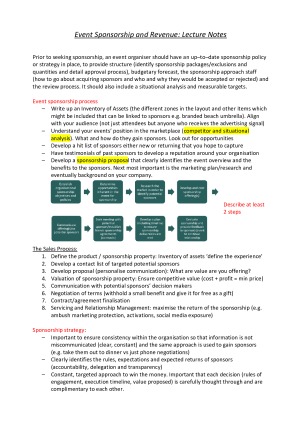 Topics include: - Diverse revenue streams - Sponsorship acquisition and process - Ethics, CSR and event management - Technology, E-Marketing and future of activations - Other Revenue Sources (broadcasting rights, donations, fundraisers, licensing etc.) - Sponsorship vs partnership Examinable material highlighted in red