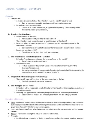Comprehensive notes created using lecture/tutorial notes, the textbook, statutory and case law materials. These notes include: - all relevant legislation - all cases including their facts and principles ALSO AVAILABLE: These notes are useful alongside the more concise Tort Law Scaffolds (available separately). Topics include: 1. Duty of Care - Established Duty - Novel Fact Scenario - Psychiatric Injury 2. Breach of Duty 3. Causation 4. Defences - Contributory Negligence - Volenti non fit injuria - Illegal Conduct - Intoxication - Self Defence - Children - Disability 5. Damages 6. Vicarious Liability - Personal Liability - Vicarious Liability - Non-delegable Duty 7. Joint and Several Liability 8. Compensation to Relatives 9. Survival Actions 10. Action for Loss of Services