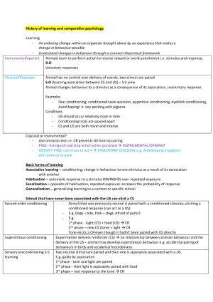 PSYC3011 Learning & Behaviour exam summary notes Topics covered include weeks 1-13 lecture content, tutorial context and readings included. Topics included are - History of comparative psychology (theorists) - Conditioning and cognition - Associative learning phenomena - Perception, attention & discrimination - Human associative learning - Learning and drug use - Learning in specific domains - Spatial learning - Flavour learning and taste aversions - social learning