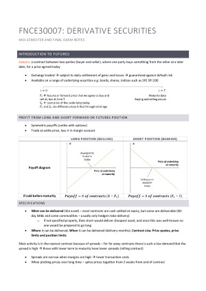 These are the notes I made for the Derivatives mid-sem exam and final exam. The course had a lot of diagrams in it to help explain the concepts. I have created all of these (and more) to help my own understanding of the concepts. This covers the topics of: Introduction to futures Hedging with futures Forward and futures pricing Introduction to options Binomial model 1 Binomial model 2 BSM Model Option pricing with dividends Delta hedging with options Simulation methods Value at risk