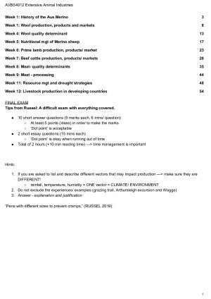 The exam was hard, barely had enough time to complete the exam. So here are the tips for your exam: - Really important to get a good pen as you will need to write your exam for 2 hours straight (no rest), the one with a rubber thing is ideal - Take notes during the 5-day Wagga excursion, they may ask questions from that - Be familiar with the case studies + all the 'farm words' Topics include: (1) Week 1: History of the Aus Merino (2) Week 1: Wool production, products and markets (3) Week 4: Wool quality determinant (4) Week 5: Nutritional mgt of Merino sheep (5) Week 6: Prime lamb production, products/ market (6)Week 7: Beef cattle production, products/ markets (7) Week 8: Meat- quality determinants (8) Week 9: Meat - processing (9)Week 11: Resource mgt and drought strategies (10) Week 12: Livestock production in developing countries PS. ***'Week 6: ICMJ intro and training theory (meat grading)' is not included*** Good luck!