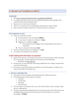 The following topics are covered - also click my profile for a concise summary of all cases in the unit guide: 1. Introduction 2. Fiduciary Relationships 3. Breach of fiduciary relationships 4. Breach of Confidence. 5. Personal remedies 6. Proprietary remedies 7. Tracing 8. Assignments