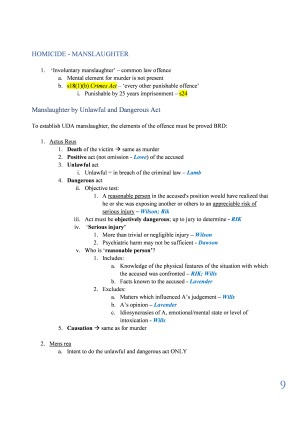 Detailed scaffolds for LAWS1016 COVERS ALL TOPICS: OFFENCES Murder Constructive murder Manslaughter by UDA Manslaughter by gross negligence Assault causing death Common assault Aggravated assault Harm offences Stalking and intimidation Consent as an answer to an assault charge Larceny Accessorial liability Joint criminal enterprise Extended joint criminal enterprise DEFENCES Extreme provocation Self-defence Excessive self-defence Duress Necessity Mental Illness Substantial impairment from an abnormality of the mind Sane automatism Insane automatism NEGATING ELEMENTS OF AN OFFENCE Intoxication Mental illness