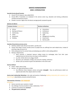 This is a summary of Service Management week 1-11. There is no week 12 due to reviewing week. Week 1 - Introduction to Service Management Week 2 - Service Encounter Week 3 - Customer Expectations, Service Quality and Customer Satisfaction Week 4 - Customer Performance Metrics, Delight and Perceived Value Week 5 - Service Communication and Management of Physical Evidence Week 6 - Service Pricing and Process Week 7 - Managing Capacity and Demand Week 8 - Customer Participation in Value Co-Creation or Co-Destruction Week 9 - Customer Relationship Management Week 10 - Service Worker Welfare & the Changing Face of Frontlines Week 11 - Service Recovery & Guarantees This note is based on the lecture and reading of Semester 1, 2019. Also, it includes some extra information. Very useful and contains explanations for certain aspects.