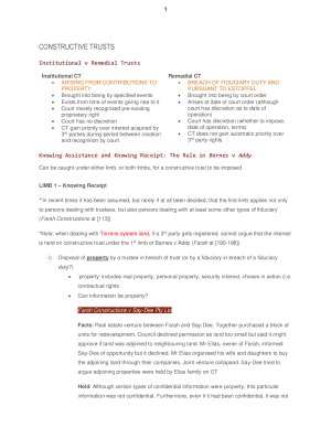 Comprehensive and carefully organised exam/course notes with process diagrams for most topics and discussion of the seminal case with quotes. List of topics covered: - Express Trusts - Resulting Trusts - Constructive Trusts - Equitable Estoppel - Unconscionable Conduct - Undue Influence - Fiduciary Obligations - Equitable Remedies Course contact hours: 3 hours p/w Overview of seminal cases referenced: - Korda v Australian Executor Trustees (SA) Limited - Commissioner of Stamp Duties (Qld) v Joliffe (1920) 28 CLR 178 - AID/WATCH Incorporated v Commissioner of Taxation [2010] HCA 42 - Calverley v Green - Crown Melbourne Ltd v Cosmopolitan Hotel (Vic) Pty Ltd [2016] HCA 26 - Commonwealth v Verwayen - Sidhu v Van Dyke - Waltons Stores v Maher - Yerkey v Jones - Garcia v National Australia Bank Ltd - The Commercial Bank of Australia Ltd v Amadio - Louth v Diprose - Kakavas v Crown Melbourne Ltd - Hospital Products v United States Surgical Corporation (1984) - John Alexander’s Clubs Pty Ltd v White City Tennis Club Limited (2010) - Farah Constructions v Say-Dee - Muschinski v Dodds (1985) 160 CLR 583 - Baumgartner v Baumgartner (1987) 164 CLR 137