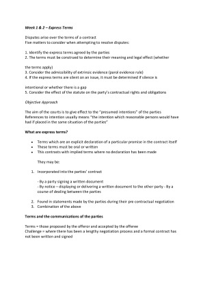 Summary notes covering all major cases throughout the course, includes all relevant ratios for ease of use in exam situations. Topics; - Express Terms - Implied Terms - Doctrine of Frustration - Performance, Breach, Termination - Termination of Contract and Remedies for Breach - Remedies - Vitiating Factors - Misrepresentation and Misleading and/or Deceptive Conduct - Abuse of Power; Duress, Undue Influence, Unconscionable Dealing