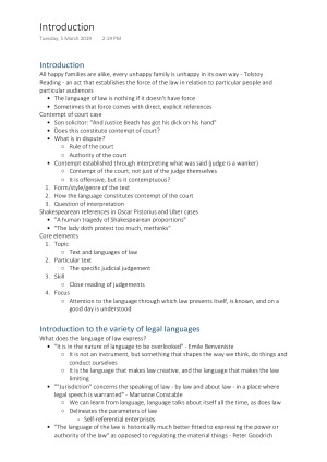 Comprehensive notes of all the lectures for Legal Language , under clear headings and dot points Topics include: - Introduction - Language and law, literature and procedure - Common law and native title - Digital life and law - Judges and judging - Standing - Equity - Negligence - Visual evidence - Civil tongue - Review These notes helped me achieve a score of 78 overall for the subject.