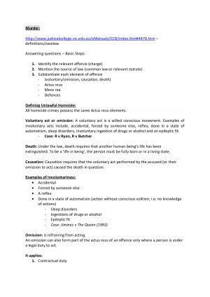 Criminal Law notes cover week 1-10, they include: -How to structure an answer -Requirements of Criminal Liability -Intentional and Reckless Murder -Manslaughter By Unlawful and Dangerous Act -Manslaughter By Criminal Negligence -Common Law Assault -Statutory Assault -Sexual Assault (Rape, Compelled Rape, Sexual Assault, Compelled Sexual Assault) -Theft and Deception -Robbery, Burglary and Strict Liability -Inchoate offences (Attempt, Incitement, Conspiracy) -Complicity including Innocent Agent -Defences (Self-Defence, Mental Impairment, Intoxication, Automatism, Duress) These are detailed notes with relevant case authority defined throughout. The notes also contain all needed statutory provisions and definitions. They are structured well for the assignments and exam however, summary pages are highly recommended for the exam if you struggle with time.