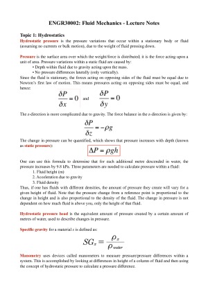 This is a comprehensive compilation of information from ENGR30002 lectures, the textbook, tutorials, practicals, workshops, problem booklets and other useful sources I found online to aid my study. Each section (particularly the harder concepts) is supported by easy to read and understand dot points, diagrams, pictures and thorough example exam-style questions. Includes all summarised formulae required to know for each topic. Topics included are: 1. Hydrostatics (pressure drops, specific gravity) 2. Bernoulli equation (friction factor, Moody diagram, shaft work, Reynolds number) 3. Pumps (types of pumps, pump efficiency, best operation points, NSPH) 4. Mixing Tanks (power numbers) 5. Compressible flow (derivation of Bernoulli equation, compressibility, gas flow, choked flow) 6. Dimensional reasoning (introduction to Bond number, Weber number, Froude number) 7. Open channel flow (specific energy) 8. Multidimensional flow (Cauchy equations, Navier-Stokes equations, rheology, cylindrical coordinates)