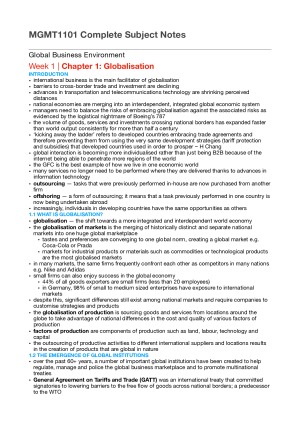 Don't waste your time with the lectures! These Distinction notes have everything you'll need for the easiest final exam and content for every assessment item. Topics covered include: Ch1 - Globalisation, The Role of Technological Change Ch2 - Theories of Trade, Investment and Internationalisation Ch3 - The Political Economy of Trade and Investment Ch4 - Foreign Exchange and the International Monetary System Ch5 - Differences in Culture, IP Protection and TRIPS Ch6 - Political and Legal Environments Ch7 - Economic Environment, Economic Systems and Economies in Transition Ch8 - Ethics and Corporate Responsibility Ch11 - Entering Foreign Markets