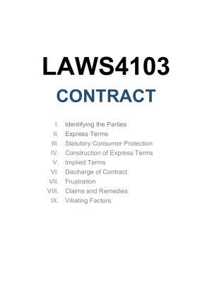 Detailed exam notes for Contract Law. Structured to answer a problem question. Covers the content from lectures and tutorials, and includes case summaries. Topics covered: 1. Identifying the Parties 2. Express Terms 4. Construction of Express Terms 5. Implied Terms 6. Discharge of Contract 7. Frustration 8. Claims and Remedies 9. Vitiating Factors Exam mark: 77%
