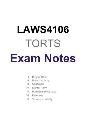 Detailed exam notes for Torts Law. Structured to answer problem questions. Includes both the CLA and case law. Covers the content from lectures and tutorials, and includes case summaries and relevant statutory provisions. Print ready. 1. Duty of Care 2. Breach of Duty 3. Causation 4. Mental Harm 5. Pure Economic Loss 6. Defences 7. Vicarious Liability