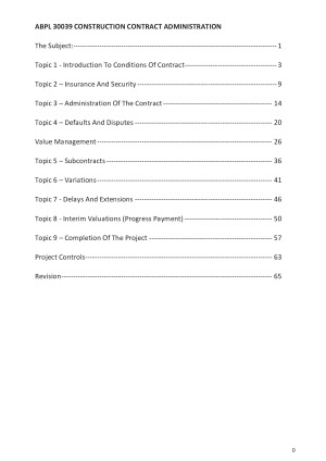 - All lecture notes including guest lectures - covered all topics (texts in black) + summarized everything lecturers says (texts in orange) + diagrams drawn during lectures + tables document include: - table of content (linked to pages) - Intro of subject - intro to conditions of contract - insurance and security - administration of the contract - defaults and disputes - value management - subcontracts - variations - delays and extensions - interim valuations - completion of the project - project controls - revision lecture