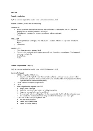 Case Law for the whole LAWS3101, summarised in one document. Good to add-on if you have your own LAWS3101 notes but want to save time in creating a Case Law summary! Topics: - Topic 1: The taxation system in Australia - Topic 2: Residence, source and tax accounting - Topic 3: Income - Topic 4: Deductions - Topic 5: Trading stock - Topic 6: CGT - Topic 7: Partnerships and trusts - Topic 8: GST - Topic 9: FBT