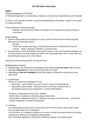 These notes cover the content from Weeks 1 to 4 The theories explored include key arguments and relevant examples discussed in class The following topics are explored: - Epistomology - Ontology - Methodology - Neorealism - Offensive neorealism - Defensive neorealism - Neoliberalism - Neoliberal institutionalism - Constructivism - Conventional constructivism - Consistent constructivism