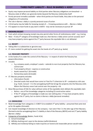 I received a HD (92) for the overall subject, with a 100% mark for the exam. These notes are designed for use in the exam. They include a clear structure, along with summaries of the cases studied. Full sentences to aid with writing exam answers are also included. Topics covered: - Breach of confidence - Breach of fiduciary duty - Third party liability (Barnes v Addy) - Remedies - Assignment of proprietary rights