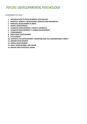 1. INTRODUCTION TO DEVELOPMENTAL PSYCHOLOGY 2. GENETICS: HEREDITY, BEHAVIOURAL GENETICS AND EPIGENETICS 3. PRENATAL DEVELOPMENT & BIRTH 4. INFANT DEVELOPMENT 5. COGNITIVE DEVELOPMENT I: PIAGET’S APPROACH 6. COGNITIVE DEVELOPMENT II: HUMAN DEVELOPMENT 7. TEMPERAMENT 8. EMOTIONAL DEVELOPMENT 9. ATTACHMENT 10. CONTEXTS FOR DEVELOPMENT: PARENTING AND THE CONTEMPORARY FAMILY 11. GENDER DEVELOPMENT 12. MORAL DEVELOPMENT 13. ADULT DEVELOPMENT AND AGING 14. MIDLIFE AND SUCCESSFUL AGING Integrated into diagrams and tables to make more understandable - very colourful and pretty!!