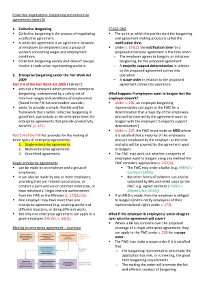 Covers topics for exam: -Workplace Health & Safety (week 6) -General Protections (week 7) -Collective negotiations, bargaining and enterprise agreements (week 8) - Termination of an Employment Contract (week 9) - Termination under the Fair Work Act (week 10) - Discrimination & Sexual Harassment (week 11)