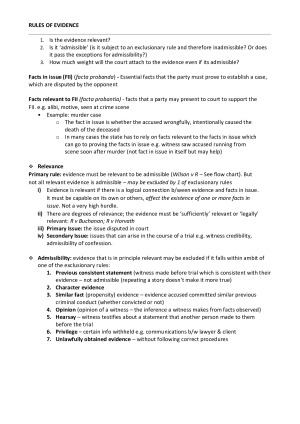 Topics include: - Rules of evidence - Burden of Proof - Classifying evidence - Witnesses - Oral evidence - Character evidence - Similar fact (propensity) evidence - Hearsay rule - Opinion Evidence - Privilege - Unlawfully obtained evidence - Evaluation of evidence Sample exam questions/answers