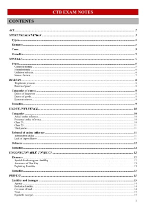 FULL CTB EXAM NOTES COVERING ALL TOPICS FROM SEMESTER 2, with readings material incorporated into it. Perfect to print (as it's in PDF form) and take into the exam! - 24 pages long typed - easy to navigate with headings and a content page. Tests, cases and authorities are in different colours to identify quickly and easily. - includes authorities (legislation and cases) for EVERYTHING - includes general basic information, as well as detailed tests for how to apply every rule - topics covered: Misrepresentation, Mistake, Duress, Undue Influence, Unconscionable Conduct, Privity, Exclusion Clauses, Misleading and Deceptive Conduct, Statutory Unconscionability, Unfair contract terms, Consumer Guarantees All made from the lecture notes by an A-grade student. See the preview for a taste of my notes.