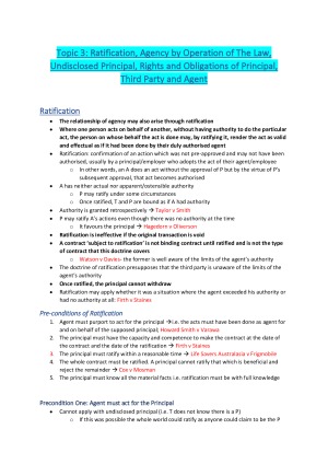 These notes cover every topic covered and assessed throughout the entirety of the unit including: Topic 1: Law Of Agency Topic 2: Creation Of An Agency Relationship And The Authority Of The Agent Topic 3: Ratification, Agency By Operation Of The Law, Undisclosed Principal, Rights And Obligations Of Principal, Third Party And Agent Topic 4: The Sale Of Goods Topic 5: Sale Of Goods - The Transfer Of Property Topic 6: Sale Of Goods - Implied Terms Topic 7: Introduction To Acl And Statutory Unconscionability Topic 8: Australian Consumer Law - Unfair Contract Terms Topic 9: Consumer Guarantees Topic 10 and 11: Insurance These notes were made using the prescribed textbook and another Commercial Law textbook i came across which appropriately mirrored the topics taught in this unit. Additionally, notes were also made using the lectures and the tutorial questions provided throughout the entire trimester. The notes contain both the appropriate legislation used in this unit and the appropriate cases (which are in red for easy reading and spotting in exams). This was the only thing i needed to bring into my exam which enabled me to get distinction.