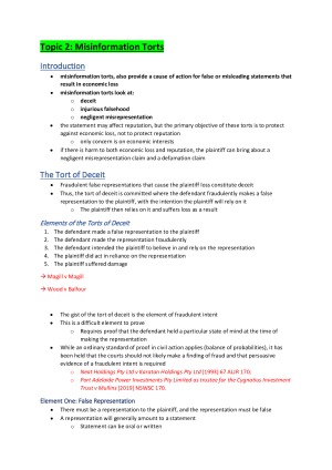 These notes cover every topic covered and assessed throughout the entirety of the unit including: Topic 1: Defamation Law and Defences Topic 2: Misinformation Torts Topic 3: The Statutory Prohibitions on Misleading Conduct and False or Misleading Representations Topic 4: Liability of Manufacturers for Defective Goods Topic 5: Other Torts Protecting Economic Interests These notes were made using the online module videos, the prescribed textbook, the seminar notes and tutorial questions provided throughout the entire trimester. The notes contain both the appropriate legislation used in this unit and the appropriate cases (which are in red for easy reading and spotting in exams). This was the only thing i needed to bring into my exam which enabled me to get distinction.