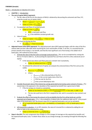 Notes include weeks 1-12 lectures and include notes from the assigned readings of the textbook/s. Relevant chapters are clearly displayed with key formulas highlighted in yellow. Tutorial material is included where appropriate. Topics: Week 1 – Introduction to Valuation (CH 1 & 2): Week 2 – Financial Statements and Historical Performance (CH 3 & KGW9/10): Week 3 – Forecasting and free cash flow (CH 10 & KGW11): Week 4 – Risk, cost of capital and capital structure (CH 4, 7 & 8): Week 5 – DCF Valuation (CH 12, 14 & 15): Week 6 – Relative valuation (CH 17, 18 & 19): Week 7/8 – Valuing private firms, IPOs (CH 24): Week 9 – M&A and LBOs Valuation (CH 25): Week 10 – Advanced Issues: Week 11/12 – Advanced Issues (Continued):