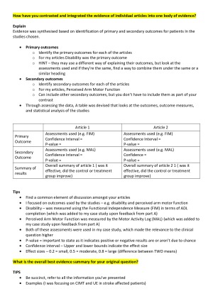 ** Final Mark for this VIVA = 35/35** This guide goes through everything you're expected to answer for your EBP VIVA. I put a lot of effort into my preparation, and am keen to share the process I used that enabled me to get full marks. I have tailored this guide to all students, I'm from an Occupational Therapy Cohort, however all disciplines would benefit from this guide as instructions are not OT specific. What's included? - Introduce your case study, clinical question and evidence found. Did you need to respond to feedback or make changes from Part B - What is the relevance, quality, strength and consistency of the evidence? - How have you contrasted and integrated the evidence of individual articles into one body of evidence? - What is the overall best evidence summary for your original question? - Can you estimate a clinical effect size, or range of effect from the evidence? If not, why? - What is your clients minimal important difference (MID) for the intervention? - What implications does this have for your client? - Are there any ICF contextual factors to be considered in clinical reasoning for this client? - Are there any professional or values-based reasoning recommendations to your client during shared decision-making? - How might you communicate your evidence-based reasoning recommendations to your client during shared decision making? All sections contain TIPS and a few definitions to help with understanding. I have 'shown' my working out on all statistical analyses, and provided tables to assist with synthesising data on the day.