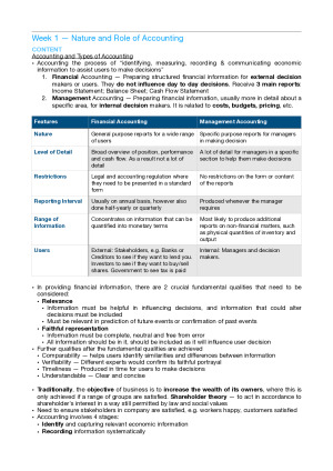 Struggling with accounting? These notes allowed to gain an 89 HD in BUSS1030.* These notes help to summarise weekly learnings into the most concise manner so that YOU have ALL the information that you need to succeed in this course, with no unnecessary information. Save yourself time by getting these notes. I read the whole textbook and went through all materials in each lectures, tutorials and consultations and combined them all in this note in a simple, easy to understand format. ✓ Succinct yet comprehensive ✓ Organised ✓ Easy to navigate and understand Get these notes now and help yourself in accounting :) TOPICS COVERED Week 1 — Nature and Role of Accounting 3 Week 2 — Aspects of Financial Reports 5 Week 3 & 4 — Business Transactions 7 Week 5 — Internal Control & Bank Reconciliation 10 Week 6 — Statement of Financial Position 13 Week 7 — Statement of Financial Performance 16 Week 8 — Measuring and Reporting Cash Flows 18 Week 9 — Analysis and Interpretation of Financial Statements 20 Week 10 — Cost Behaviour and Cost Volume Profit 24 Week 11 — Costing 28 Week 12 — Planning and Budgeting 32 * You can message me and I will provide you with an academic transcript of my result.
