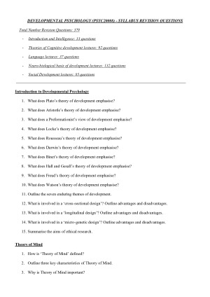 I created these revision questions as a way of preparing for the Developmental Psychology exam. This document contains 378 (!) short answer revision questions that comprehensively address the entire course content in painstaking detail. These questions helped me to achieve a high H1 for the subject.