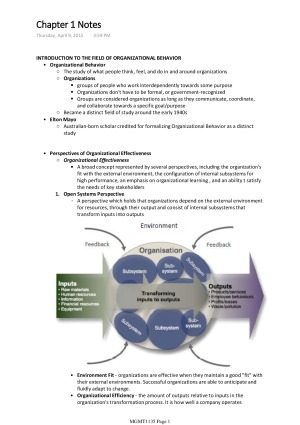 Notes on topics from every chapter of "Organisational Behaviour" by McShane, Olekalns, and Travaglione. Chapters 1-15 and Appendix A. Including charts and graphs.