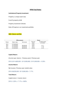 Topics covered in the notes include: - > WK 4- Return and Risk > Wk 6- Risk Adjusted Return Calculate > WK 7- Mixed Asset Portfolio > Wk 12- Unlisted Property Funds > WK 13- Valuation of A-REITs The notes include lengthy description of important content followed by relevant examples. The Paper also includes practise question at the end.
