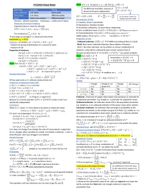 This cheat sheet covers important topics, steps for calculation, definitions and proofs that will be beneficial for the exam and throughout the semester. It is important to note that the cheat sheet on the exam must be handwritten, and as such, this should be used as a guide to help you through the semester, in your revision and to write your handwritten double-sided cheat sheet. Please make sure to double check the unit guide for the exam cheat sheet specifications. Topics Covered: 1. Introduction 2. Review of Statistical Concepts 3. Linear Regression (OLS) 4. More on Linear Regression Analysis 5. Inference 6. Model Selection/Prediction 7. Binary Variables 8. Heteroskedasticity 9. Serial Correlation 10. Persistence in Time Series Data 11. Large Sample Properties of OLS 12. Revision