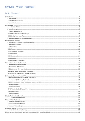 CIV4288 Notes: Water treatment course summary notes and 10pg exam cheat sheet for use in open book exam