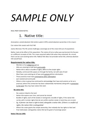 Extensive, complete notes for Real property law. Includes case summaries, legislation and how to answer questions for each topic. Will ensure you can answer any question.