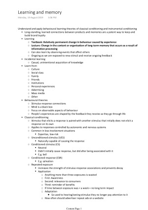 These notes comprehensively cover ALL lecture and textbook content (both of which are assessed in detail) from the latest version of the course (S2 2019). Topics: Introduction Perception Learning and memory Demographics Buying and using Disposing Attitudes and attitudinal change Individual decision making and habits The self and groups The culture of consumption Motivation and values Personality