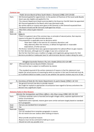 Exam case summaries created in Trimester 3 2019 for LAW5014 Principles of Administrative Law (Monash JD). These summaries are designed to give a clear outline of critical facts, what was held, the rationale of the decision and the key legal principle established. They also note the court, legal citation, and the name of the judge(s) involved in the decision. These Notes Include: -Introduction to Administrative Law -Jurisdiction to Conduct Judicial Review -Standing -Reasons for Decisions -Grounds for Judicial Review (Ultra Vires) -Grounds for Judicial Review (Procedural Fairness) -Grounds for Judicial Review (Jurisdictional Error) -Remedies -Privative Clauses -Tribunals & Merits Review Note: For the best preview of the notes, view the 'preview' on a non-mobile device. Disclaimer: The accuracy of these notes is not guaranteed