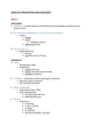 This is a complete set of notes for MGMT1135 Organisational Behaviour that took me the entire semester to collate! These are notes that I have typed myself that consist of information from: - lecture slides - lecture recordings - tutorial notes - tutor's notes/comments - textbook - own research This unit is quite tricky to grasp just by watching/reading the lecture slides, I needed to read up more one some of the theories myself (textbook/google) to find out more. This took me really long to make so that you don't have to! (makes no sense to spend so much on a first year unit, so why not let me do it for you). I did really well for the unit just by reading my set of notes the night before and on the day of the exam, got through it pretty easy as I included tips on memorising content (with acronyms), which might be helpful for you too!