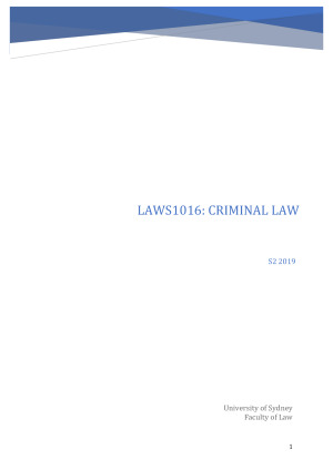 Comprehensive and well explained final exam notes for LAWS1016/LAWS5004 created from a range of resources: seminars, the prescribed textbook (David Brown et al 6th ed), case/legislation, extended readings and online content. Notes relate to LAWS5004 but cover all necessary aspects of the LLB Criminal Law subject. The download file contains: 1. Complete notes, covering the content from every single seminar throughout the semester. 2. Summarised scaffolds for the studied offences/defences (highlighted in the table of contents). Makes it easy to flick through during the exam. The scaffolds are done in a flowchart (see the murder extract) which logically flows from one part to the next, AR -> MR -> Temporal Coincidence etc. 3. Example questions & answers These notes allowed me to achieve a 'high(er)' distinction (lol) in the course. Hope they also help you achieve stellar marks. Good luck!