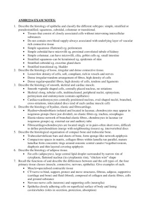 This is a concise version of the lecture notes answering the learning objectives, these notes were used for the written exam. The learning objectives answered are as follows: -the histology of epithelia and classify the different subtypes: simple, stratified or pseudostratified; squamous, cuboidal, columnar or transitional. -the histology of loose, irregular and dense connective tissue. -the histology of smooth, skeletal and cardiac muscle. -the histology of hyaline, elastic and fibrocartilage. -the histological organisation of compact bone and trabecular bone. -the histology of adipose tissue. -the functions of and describe the differences between and the cell types of, the four primary tissue classes (muscle, connective, nervous, epithelia) -the histology of the heart wall -the structure, arrangement and function of vessel walls -the differences between arteries/arterioles, veins/venules and lymphatic vessels. -the role of blood & lymphatic vessels in the circulatory system. -the role of each lymphoid organ (and its variable components) in the system. -key histological features of each lymphoid organ. and describe the cells of the respiratory epithelium. -Distinguish the difference between a bronchus, bronchiole, respiratory bronchiole, alveolar duct and alveolar sac. -the functions of type I and type II pneumocytes (alveolar cells). -the two separate blood supplies to the lungs and understand their functions. -the epithelial differences between the internal and external lip. -the muscles of the lip and tongue and recall the nerves that innervate them. -the types of tongue papillae and understand their differences. -the different compositions of the salivary glands and their parasympathetic innervation. -the changes in epithelium along the length of a salivon. -the four characteristic layers of the GIT throughout its length. -Understand how the mucosa, submucosa, muscularis externa of each organ of the GIT is specialised. -the functions of the liver, gallbladder and pancreas. -the dual blood supply of the liver. -how to differentiate the pancreas from a salivary gland. and describe the structural & functional specialisations of each gland. -the structural and functional relationship of the hypothalamus & the hypophysis. -the embryological development of the hypophysis and how it relates to the structure & function of the mature gland. -Understand the structure and important function of the hypothalamo-hypophyseal portal system. -Define and describe a nephron and a renal corpuscle. -Identify and understand the general functions of the macula densa, proximal convoluted tubule, nephron loop, vasa recta, distal convoluted tubule & collecting ducts. -the blood supply to the kidney, nephron. -the structure and function of the ureters, urinary bladder and urethra. -the gross structure of the testis. -between spermatogenesis and spermiogenesis. -the main functions of sustentocytes -the main functions of interstitial endocrine -the hormonal control of spermatogenesis. -the ducts involved in the passage of sperm. -the accessory sex glands and know their role. -structural features distinguishing the stages of follicular development -what occurs during the follicular phase and luteal phase of the ovarian cycle. -what occurs during the proliferative phase and secretory phase of the menstrual cycle. -the structure of the uterine tube, cervix and vagina, and non-lactating breast.
