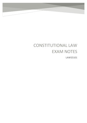 Very detailed exam notes for Constitutional Law at UWA. Easy to navigate with numerical headings and colour codes. Notes have been structured to include step by step guidance on answering problem questions. TOPICS: 1. Constitutional interpretation and characterisation 2. Trade and commerce power s51(i) 3. Taxation 4. Appropriation 5. Commonwealth Expenditure 6. Grants Power 7. Defence power s51(vi) 8. Implied freedom of political communication 9. Judicial power Ch III 10. Intergovernmental immunities 11. Inconsistency s109