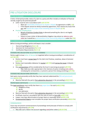 Comprehensive, well-structured notes with literally everything you need to know for this unit. Colour coordinated to allow for easy cross-referencing between topics (especially helpful for overarching obligations. Includes all lecture slides and notes, with case summaries for key cases and detailed policy notes on class actions and access to justice. All topics covered in the course are included: - Case Management and Overarching Obligations - Jurisdiction - Parties and Causes of Action - Joinder of Claims/Parties - Commencement, Service and Appearance - Class Actions - Interlocutory Applications - Pleadings - Discovery - Disposition - Costs