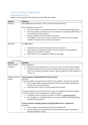 Examination style notes including statutory and case law authority. Topics include: - Classification of trusts - Certainty of intention - Certainty of object - Certainty of subject matter - Constitution - Quistclose trusts - Statutory formalities - Charitable trusts - Trustee's powers and duties - Powers and rights of trustees - Rights and remedies of beneficiaries