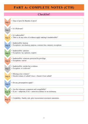 A super in-depth step-by-step guide to problem-solving for an Evidence Law exam question. Extremely helpful for any law student about to sit the Evidence exam. Includes flowcharts which easily break down even the most difficult topics. Covers both the Commonwealth Evidence Rules (Part A) and the Western Australian Evidence Rules (Part B). Extensively covers: - The structure of a Trial; - Relevance and admissibility; - Presumptions; - Prima fascia cases; - No case submissions; - Onus and standard of proof; - Judicial notice; - Formal admissions; - Competence; - Compellability; - Privilege; - Examination of witnesses; - Similar fact evidence; - Documentary evidence; - Hearsay; - Opinion Evidence; - Confessions and admissions; - Illegally obtained evidence; - Identification evidence; - Corroboration; - Prior determination; - The Jones v Dunkell Rule; and - Ethics. Note that these notes cover a civil, not criminal, trial. However, almost all of the content is applicable to a criminal trial. The only difference between the two would be the standard of proof is higher and that the terminology shifts from the 'Plaintiff' to the 'Prosecution'.