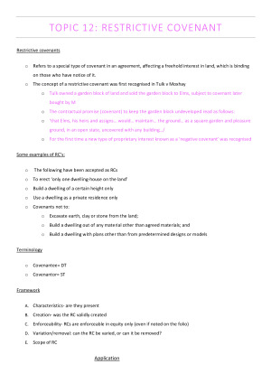Weeks 1-12, (noting topic 6 was non-examinable but still included) Included: - case summaries - relevant legislation/ cases sighted - notes from lectures/ readings comprehensively combined - how to apply in exam scenario - completely colour coded for easy application - explanation of terminology and examples where unclear Topics: 1: The concept of Property 2: Fragmentation of Proprietary Interests 3: Introduction to Land Title 4: Legal and Equitable Interests in Land 5: The Doctrine of Tenure and Estates 6: Relativity of Titles; Adverse Possession 7: Transfer/ Sale of Land and Gifts 8: Leasehold Estates 9: Creation of Leasehold Interest 10: Contractual Licenses 11: Easements 12: Restrictive Covenant