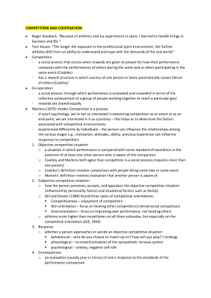 Comprehensive notes from the whole semester, which cover the following topics: Competition and Cooperation Exercise Behaviour and Adherence Feedback, Reinforcement, and Motivation Non-conscious Processes In Physical Activity Group Dynamics Team Identification Relationships in Sport and Exercise Negotiation Exercise and Well-being Resilience Persuasion: Fear Appeal Got an HD for this unit.