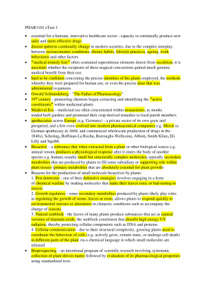 Comprehensive notes from all lectures and e-tutes. Got a perfect score on all quizzes and an overall HD (95%) for PHAR1101 using these notes. Lectures: Introducing Drugs Alcohol Ether Penicillin Thalidomide Nitroglycerin Chlorpromazine Contraceptives Mustard gas The Future of Drugs e-Tutorials: Finding new medicines in nature (Bioprospecting) Animal disease models 'Me-too' drugs Serendipitous discovery Rational drug design Irrational discovery