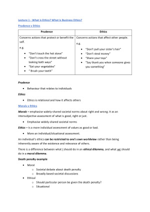 HD Business Ethics and Sustainability Notes (21513) Comprehensive Notes and really helpful for the mid-semester assignment and final assignment. Topics covered include: Lecture 1 - What is Ethics? What is Business Ethics? Lecture 2 – Ethics and Management in the 21st Century Lecture 3 – Ethics, Leadership and Justice Lecture 4 - Organizational Culture and Ethics Lecture 5 – Ethics, (Gender) Diversity and Discrimination Lecture 6 – Business Ethics and Sustainability Lecture 7 – Managing for Sustainability in a Global Context Lecture 9 – Business Logic of Organisational Sustainability Lecture 10 – Strategic Proactivity