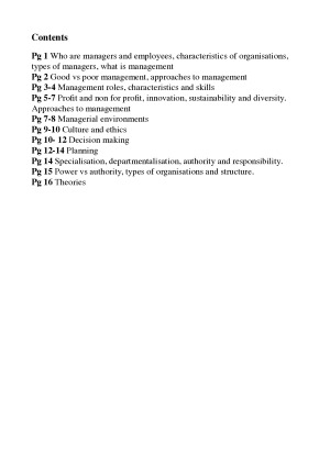 Managers and employees Characteristics of organisations and managers Good Vs Poor management Approaches to management such as classical, quantitative and modern Management roles and skills Management theories such as Henri Fayol, Mary Parker Follet, Hawthorne, McGregor and more. Global awareness Managerial environments Ethics and responsibility Decision making processes Planning and goals Power and authority